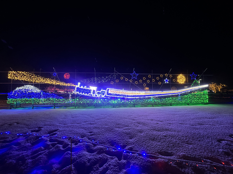 冬季のイルミネーションイベント。雪景色とライトアップのコンビネーション。
