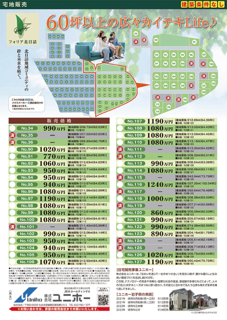 各区画の詳細や建築条件については、専用のチラシを作成し、紫波町情報交流館に設置しております。